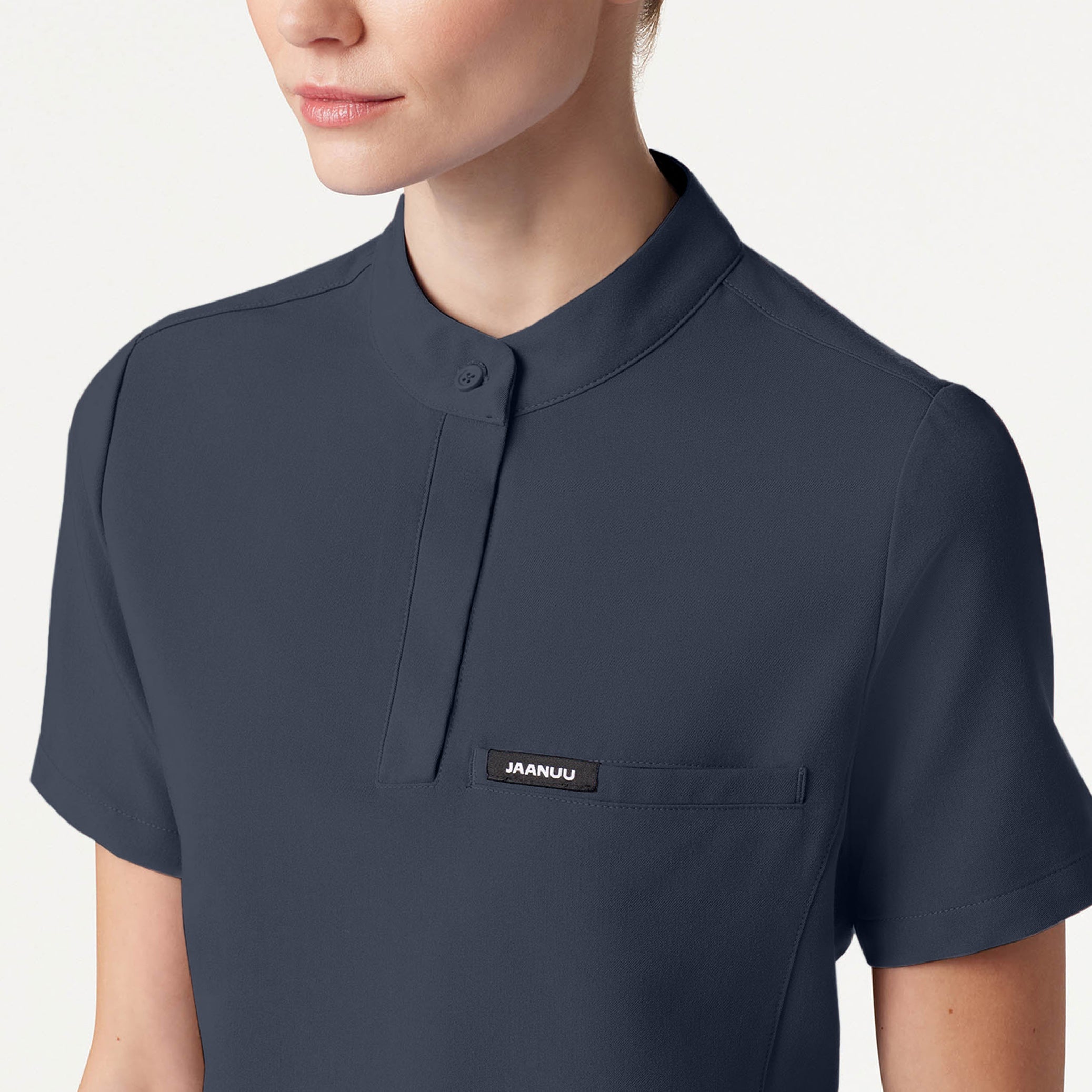 Our most essential fit gets a modern refresh with a banded collar and hidden buttons. This style pairs best with JAANUU UltraLAST™ scrub pants.